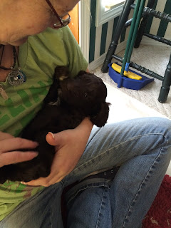 Ellie's yellow puppy is smaller. Playful and sweet.